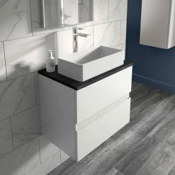 Hudson Reed Urban 600mm Satin White Vanity Unit – Wall Hung 2 Drawer Unit With Black Worktop