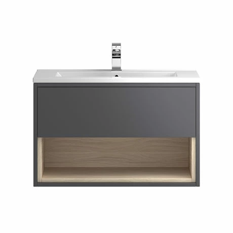 Hudson Reed Coast 800mm Wall Mounted Vanity Unit with Open Shelf & Basin – Grey Gloss/Driftwood