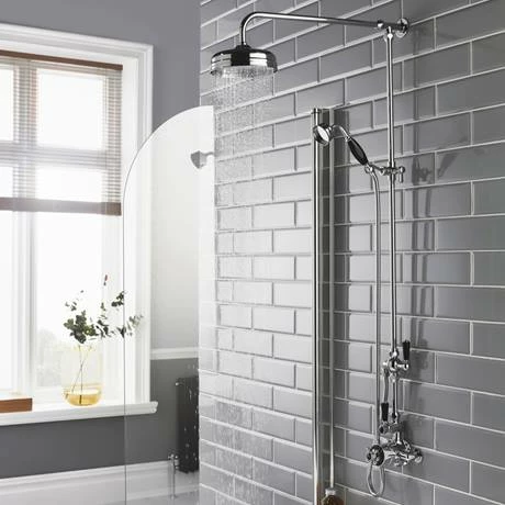 The Hudson Reed Topaz Black Grand Rigid Riser Kit with Diverter enhances the appearance of any bathroom with its eye-catching period design. It features an 8″ shower rose and has a built-in diverter so you can switch between the fixed head or hand held shower. The turn of the century evokes a feeling of greatness, an era when engineering was the world’s driving force, and this sense of achievement is replicated in our collection of traditional styled rigid riser shower kits.