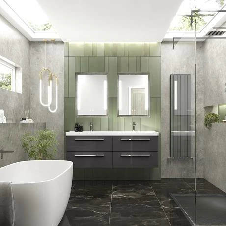 This double vanity unit with basins has four storage drawers, perfect for couples or families. The Quartet range from Hudson Reed contains a wide range of vanity units, including this large double vanity. Striking in gloss grey, pair this double unit with a stylish back to wall toilet for a high-end designer look.